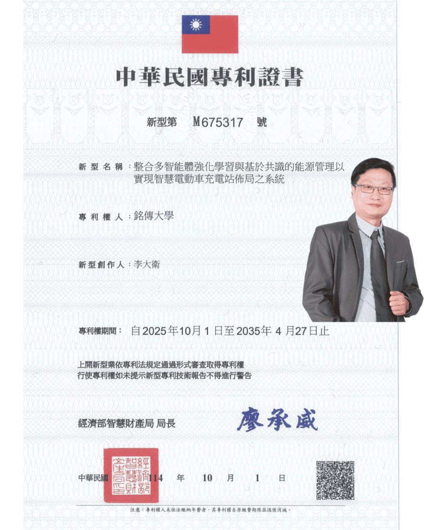Congratulations to Professor David Li on receiving the Republic of China (Taiwan) Utility Patent Certificate! 👏 📜 Patent Title: “An Integrated Multi-Agent Reinforcement Learning and Consensus-Based Energy Management System for Smart EV Charging Station Deployment” 📅 Patent Period: October 1, 2025 – April 27, 2035 The innovation marks a significant step forward in the development of smart transportation and highlights …